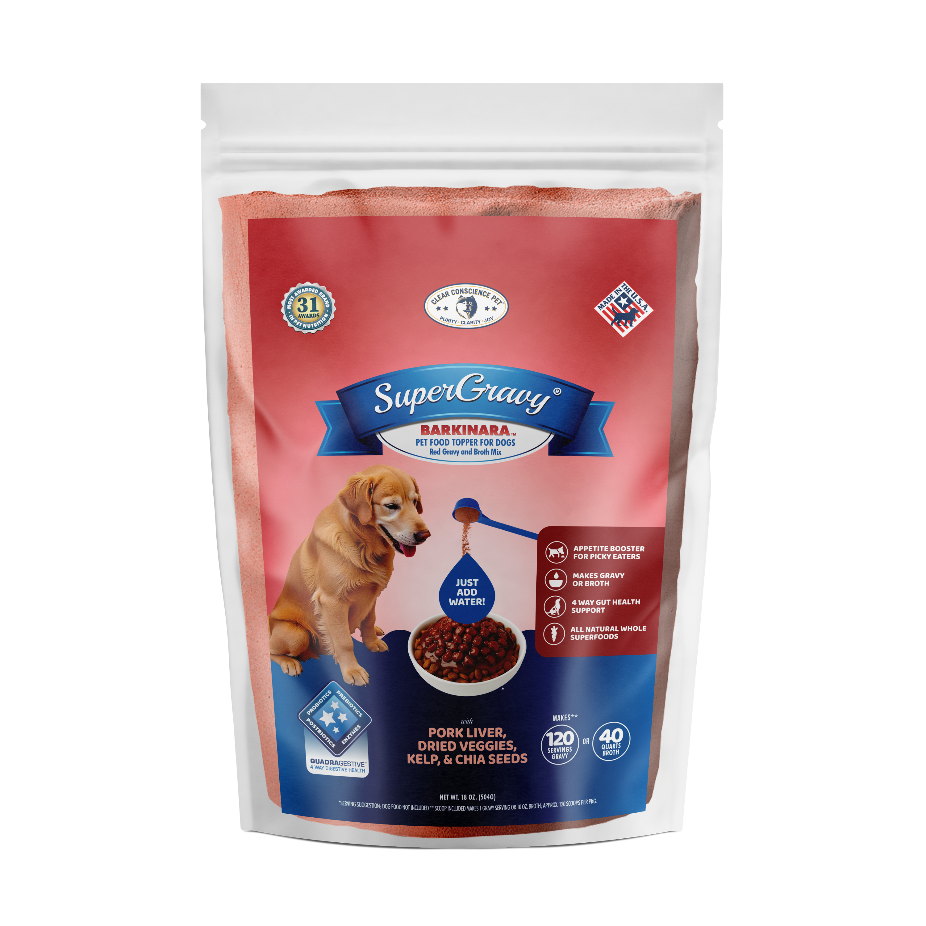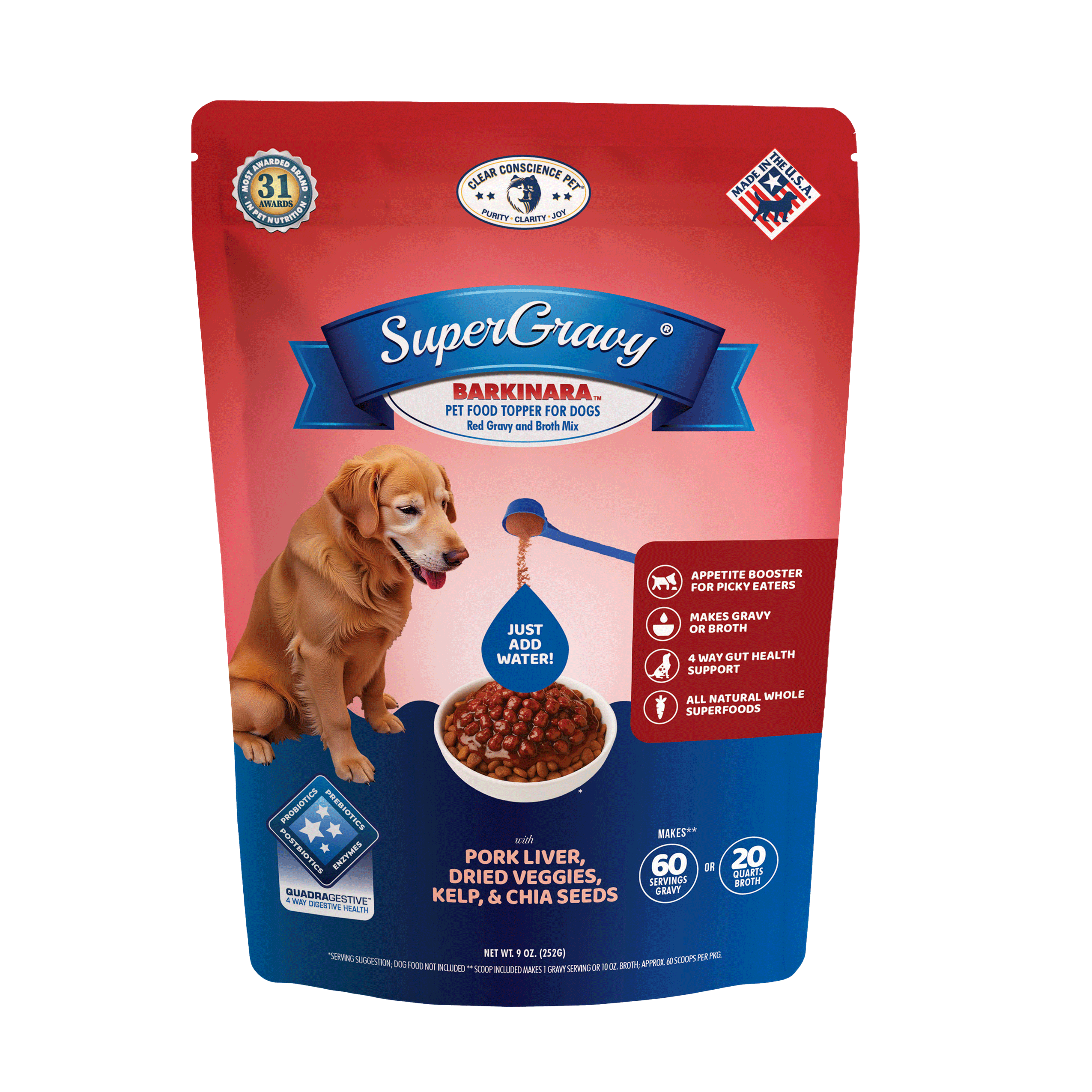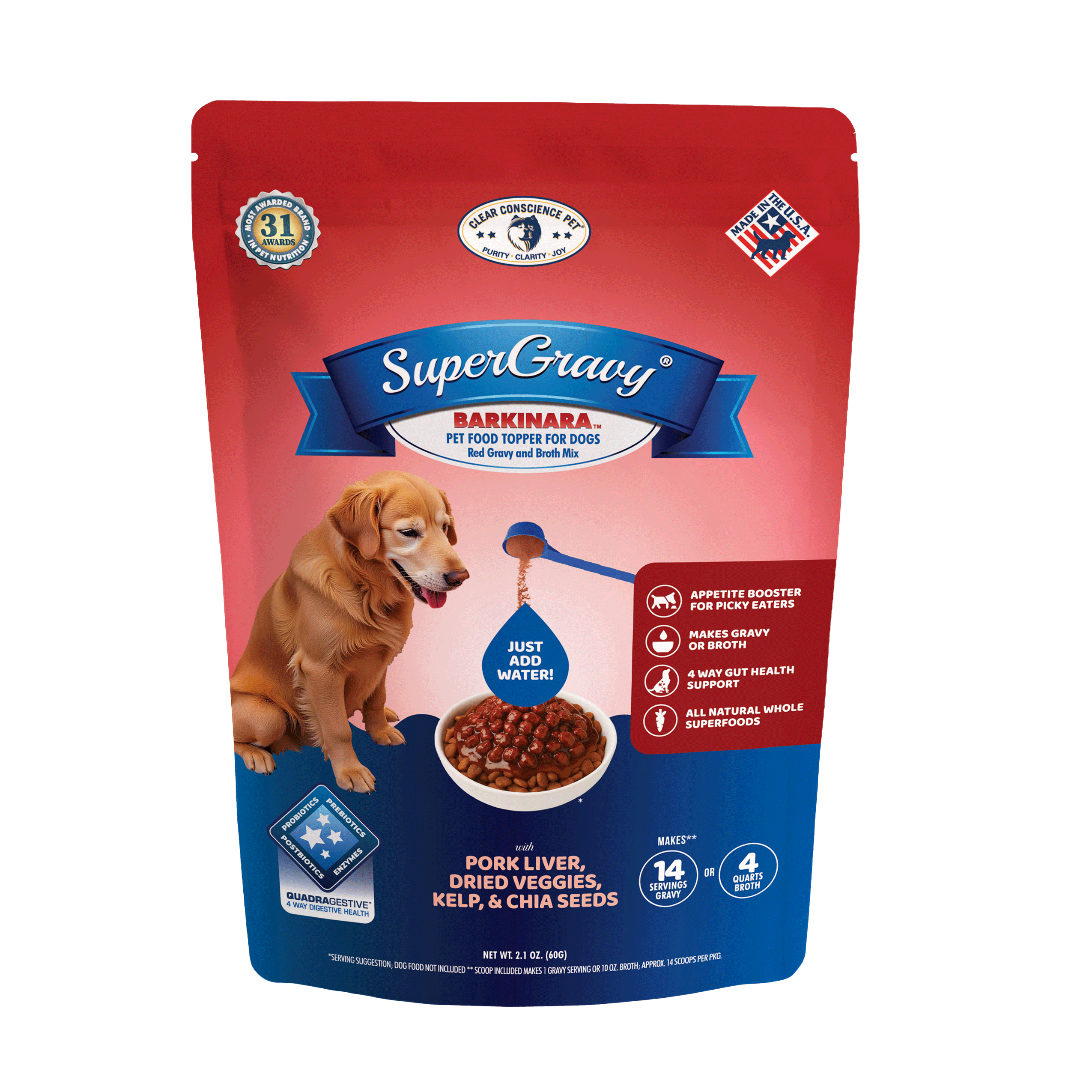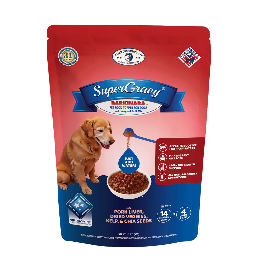 SuperGravy® and all Clear Conscience Pet® treats are made in the USA in USDA inspected plants. PROTEINS: All animal-based proteins are 100% USA made from American ranches and dairy farms. Animal-based protein sources include Beef liver, Pork liver, Greek Yogurt, Beef Bone Broth, Dried Parmesan Cheese, Dried Provolone Cheese, and Dried Romano cheese. VEGETABLES: Most of our dried vegetables are made in the USA, and some from Europe. Our Sea Kelp comes from Iceland and Ireland, and Chia Seed comes from South America. There are NO ingredients from China or India. PROBIOTICS, PREBIOTICS, and DIGESTIVE ENZYMES: Our TRIGESTIVE ™ digestive health complex is made in the USA.