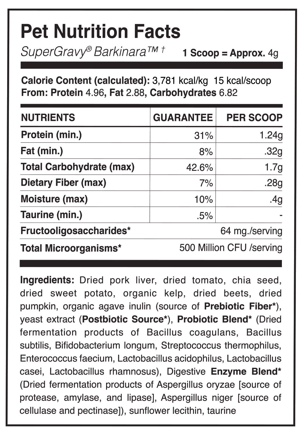 SuperGravy contains Taurine, an amino acid considered important to carnivore health. (NOTE: Added Taurine does not substitute for a balanced diet high in clean animal source proteins)