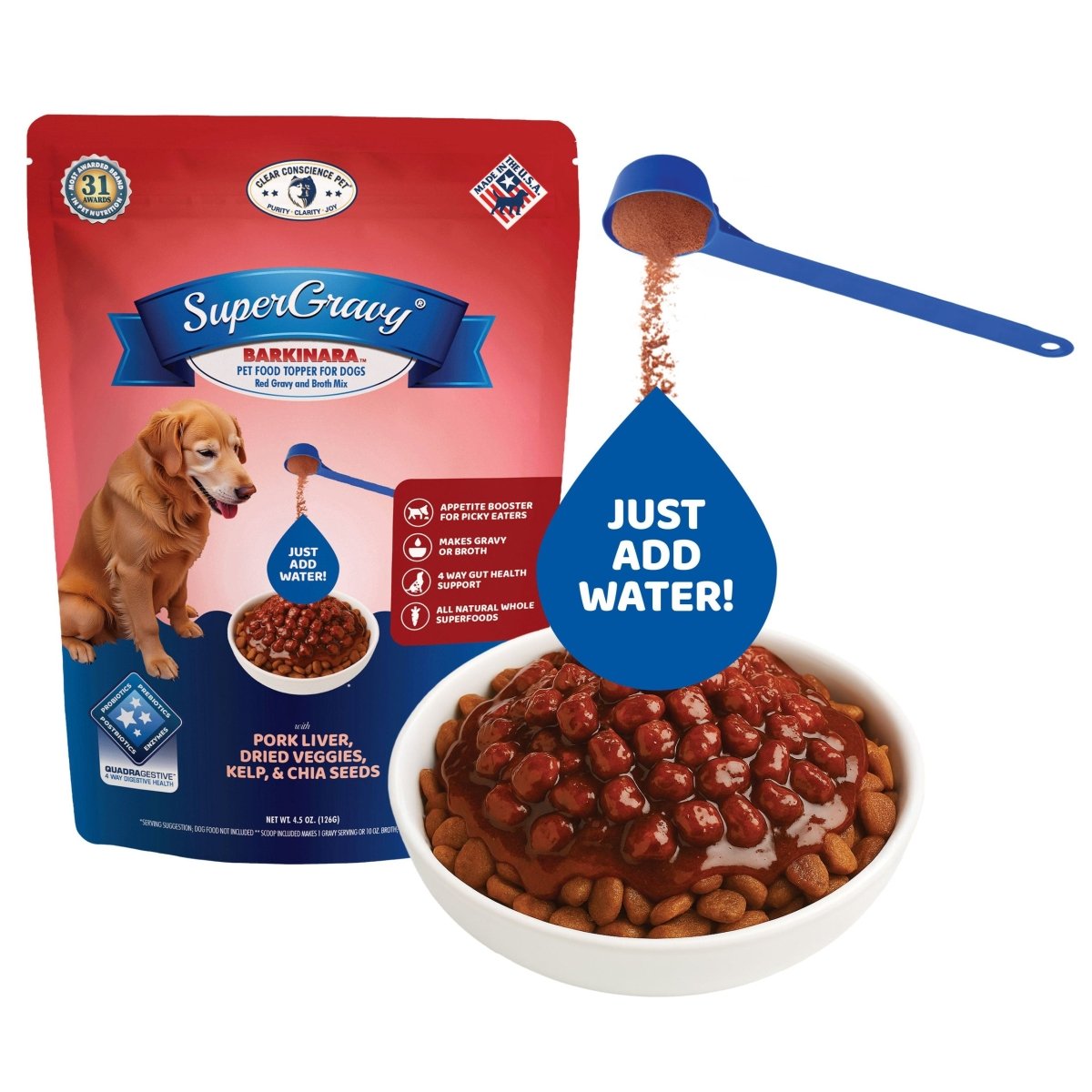 SuperGravy® and all Clear Conscience Pet® treats are made in the USA in USDA inspected plants. PROTEINS: All animal-based proteins are 100% USA made from American ranches and dairy farms. Animal-based protein sources include Beef liver, Pork liver, Greek Yogurt, Beef Bone Broth, Dried Parmesan Cheese, Dried Provolone Cheese, and Dried Romano cheese. VEGETABLES: Most of our dried vegetables are made in the USA, and some from Europe. Our Sea Kelp comes from Iceland and Ireland, and Chia Seed comes from South America. There are NO ingredients from China or India. PROBIOTICS, PREBIOTICS, and DIGESTIVE ENZYMES: Our TRIGESTIVE ™ digestive health complex is made in the USA.