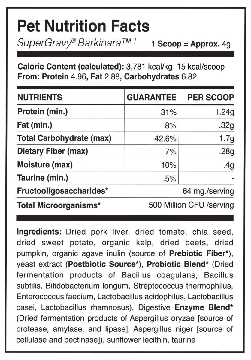 Just add water to make healthy and delicious superfood GRAVY or BROTH that enhances food with live probiotics, prebiotics, and enzymes that are cooked out of commercial pet foods. SuperGravy naturally transforms dry kibble, freeze dried, frozen, or any pet food into a healthier, more digestible, and irresistibly delicious meal